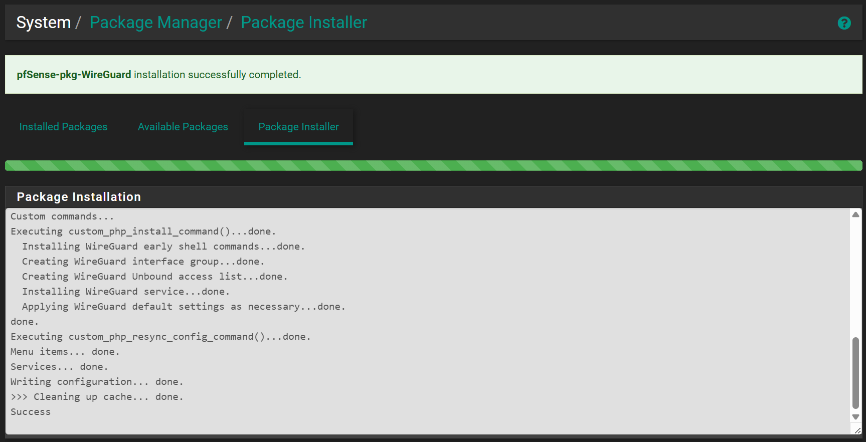 When you click Install, pfSense will automatically download and set up WireGuard in the background.