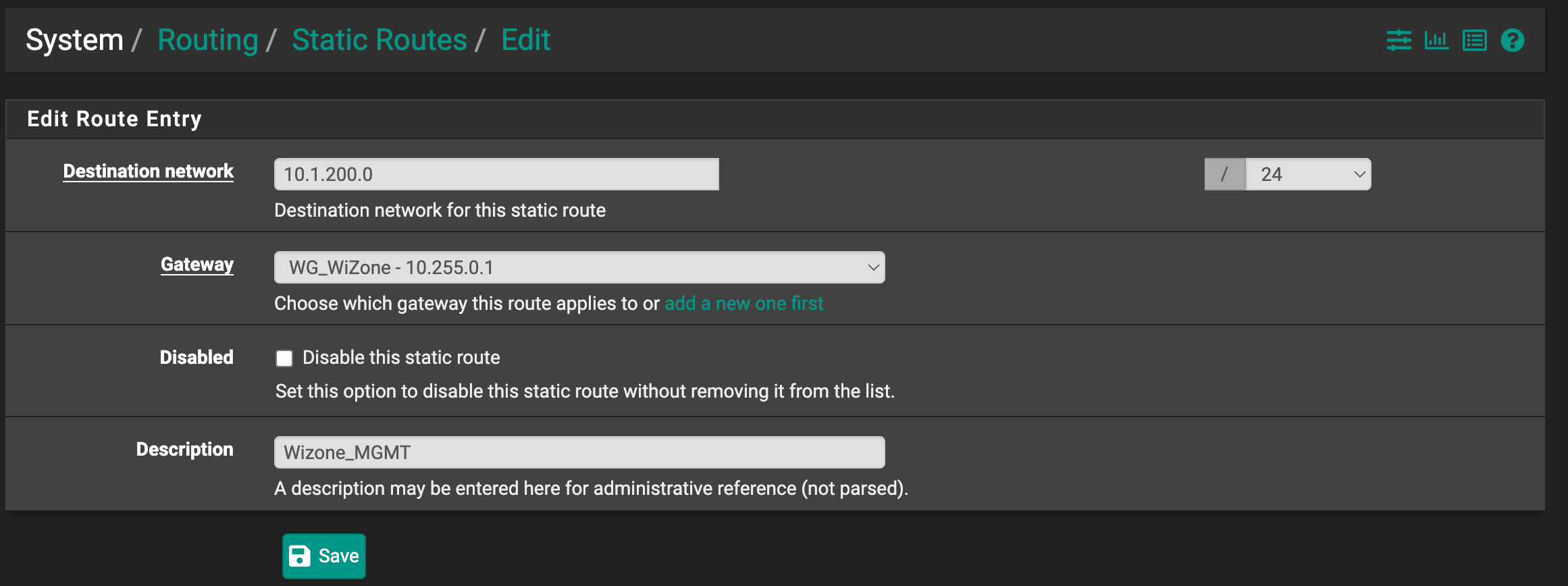 | Gateway | WIZONE_GW - 10.255.0.1 | Gateway created in Step 1 |